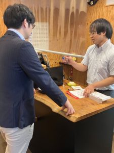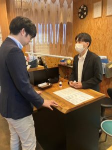 先輩薬剤師に患者さん役になってもらい練習しました。とても緊張しています…